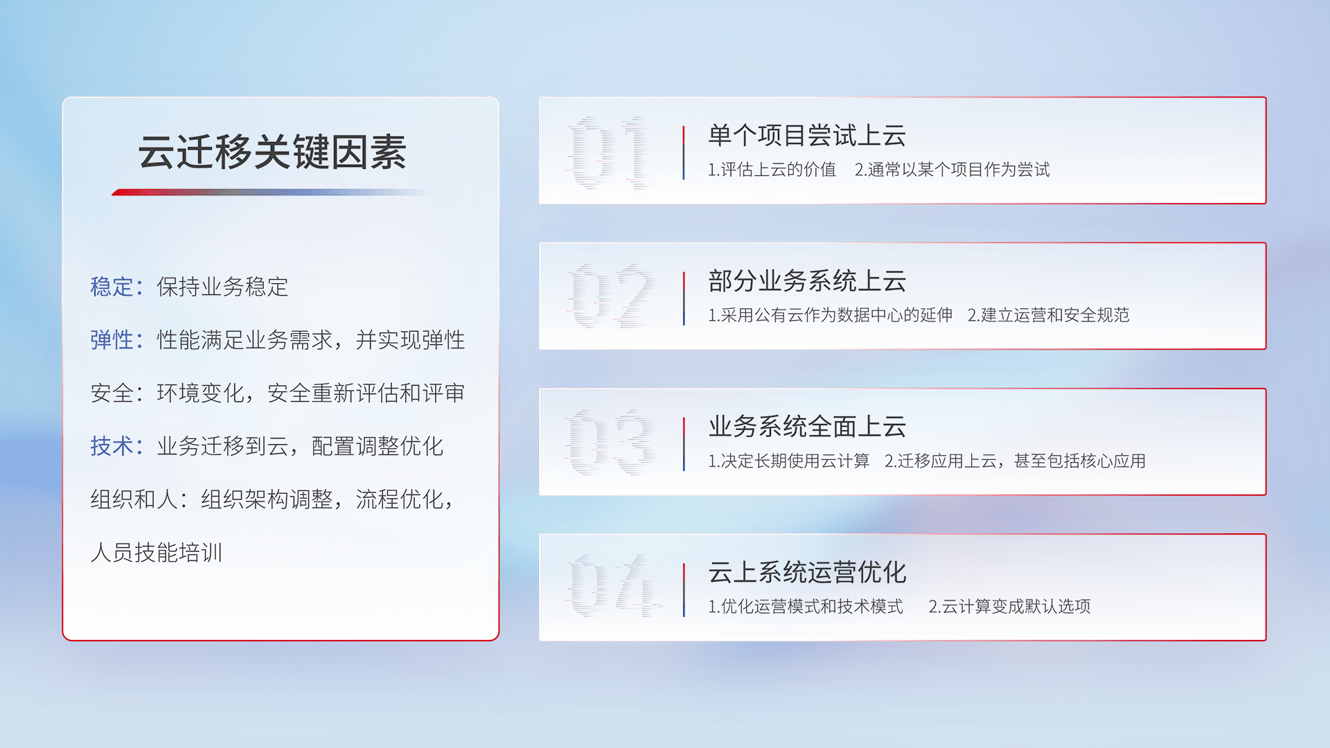 结合实际业务,,,从规划设计、、、、云平台选型、、、、云原生改造、、数据迁移、、、、集成交付,,,,迁移全过程为客户识别最佳上云路径,,做好风险识别管理,,,设计网络架构、、、身份权限、、安全审计合规、、、操作审计、、日志审计、、监控告警策略、、、、多站点容灾设计等,,,,对云上基础设施进行整体规划,,,提升IT治理水平,,以满足弹性、、、、高可用、、、、高性能的需求。。。