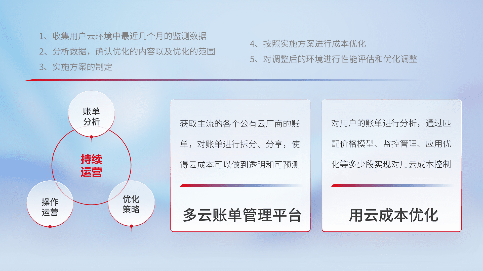 通过多云纳管,,以统一的资源数据模型把客户的云资源进行抽象和封装,,,,进而实现对多云资源的统一操作,,保障云资源管理的可靠性、、稳定性与可用性。。。。量身定制化运维内容,,,配置、、开发运维、、补丁管理、、、、备份、、监控、、认证和访问管理、、审计和日常巡检等,,保障在用云过程中的可靠度,,,,稳定度以及高可用率。。。